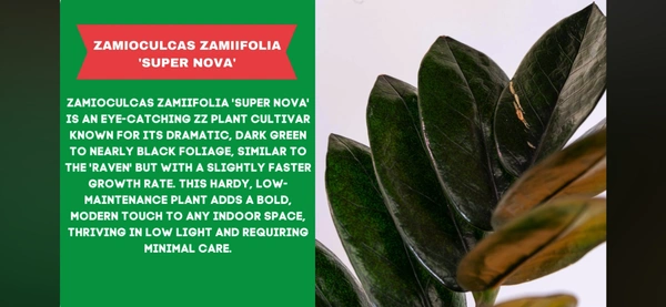 ZAMIOCULCAS ZAMIIFOLIA 'SUPER NOVA' IS AN EYE-CATCHING ZZ PLANT CULTIVAR KNOWN FOR ITS DRAMATIC, DARK GREEN TO NEARLY BLACK FOLIAGE, SIMILAR TO THE 'RAVEN' BUT WITH A SLIGHTLY FASTER GROWTH RATE. THIS HARDY, LOW-MAINTENANCE PLANT ADDS A BOLD, MODERN TOUCH TO ANY INDOOR SPACE, THRIVING IN LOW LIGHT AND REQUIRING MINIMAL CARE.